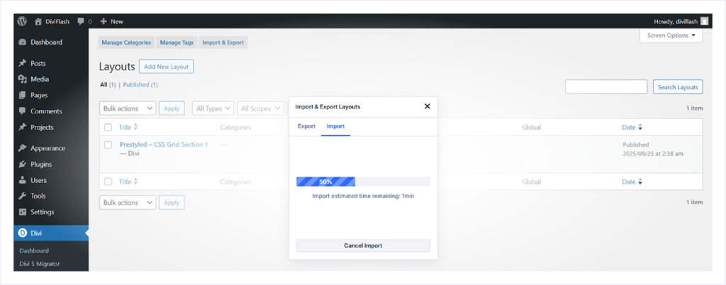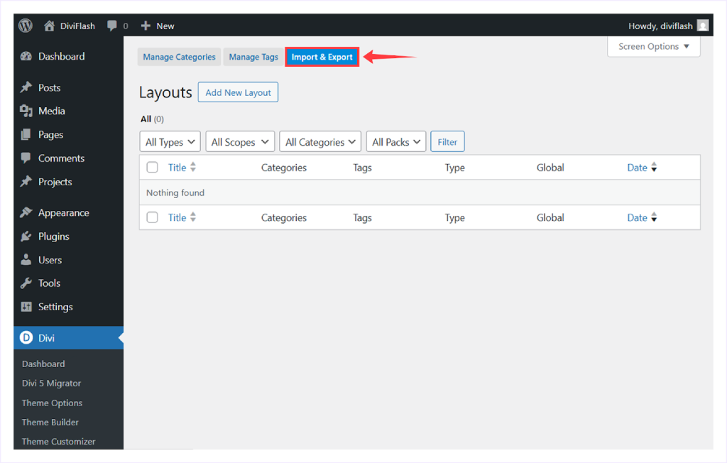 - Go to your WordPress Dashboard → Divi → Divi Library.
