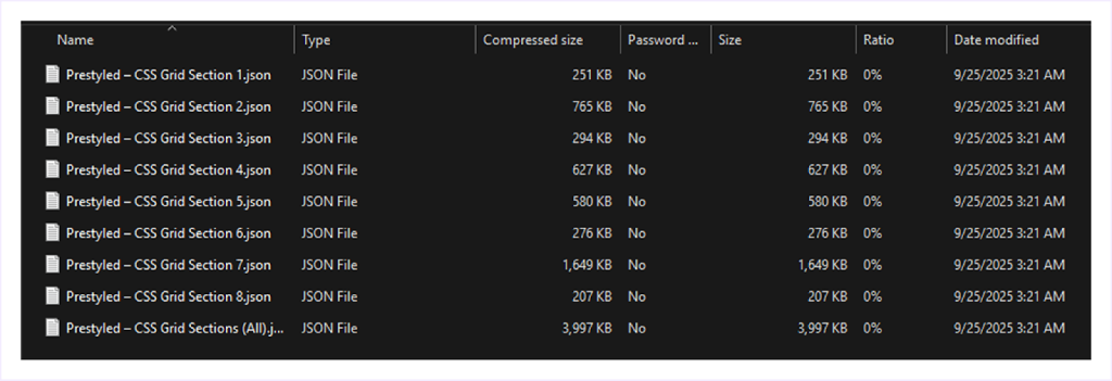 Note: You can import these files one by one to your Divi Library. Or, you can import all together by importing the last file named “Presetyled – CSS Grid Section (All). json”.