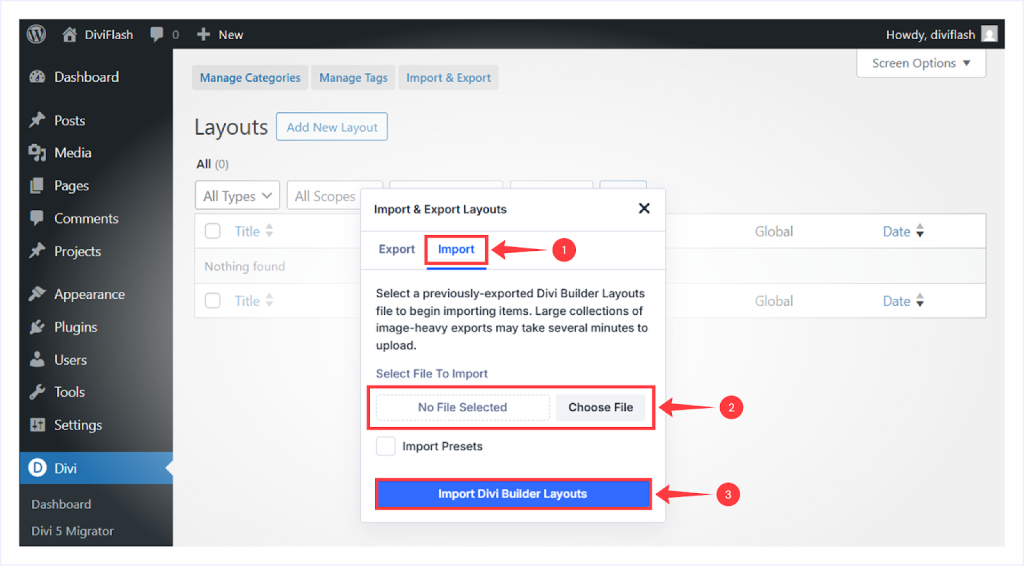- Select Import and choose the JSON file from your computer, and click “Import Divi Builder Layouts”.