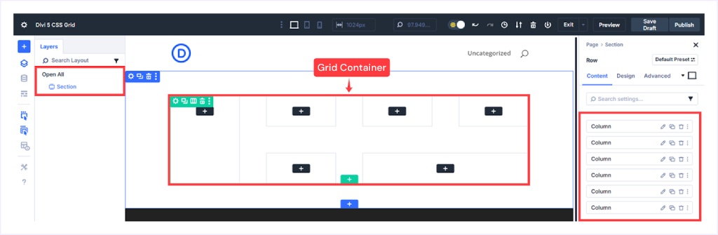If you take a look at the Divi Builder, the highlighted section or rows you are editing, or where you see “Columns” listed on the right sidebar, is your Grid Container.