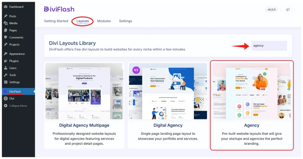 Step 3: In your WordPress dashboard, go to DiviFlash > Layouts and search for Agency.