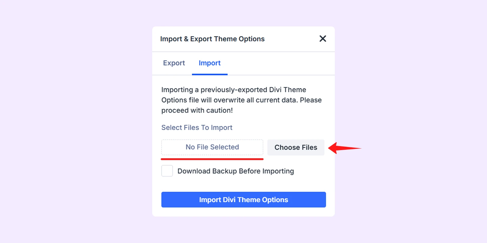 - Select the Import tab and click “Choose Files” to upload the JSON file named “Divi Theme Options – Agency Layout – Diviflash.json”