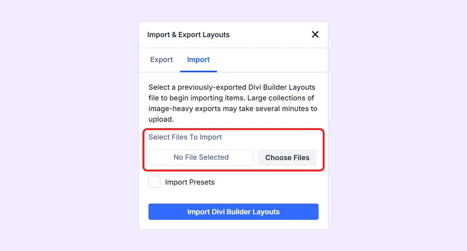 - Select the Import tab and click “Choose Files” to upload the JSON file named “All In One – Agency Layout – Diviflash.json” (You can also import individual layout pages one by one by using their respective JSON files.)