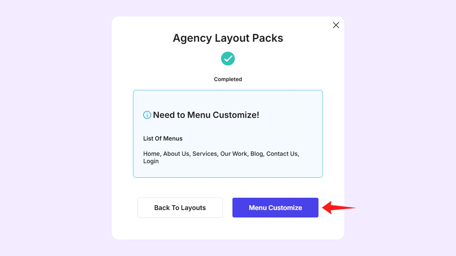 - Once the import process is complete, click on “Menu Customize” to adjust the menu for the imported layout. You can follow Divi Layout Menu Customization guide.