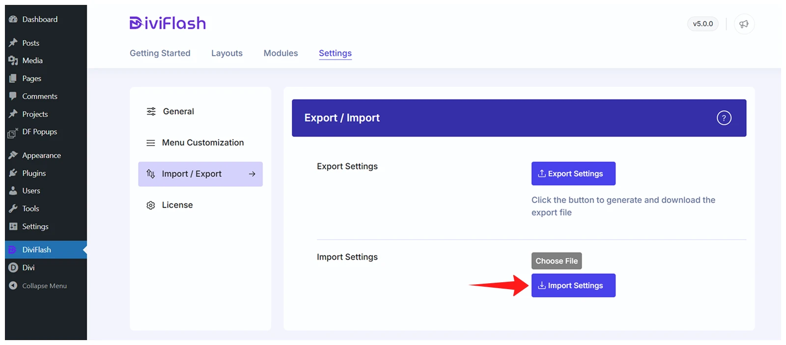 - Navigate to WordPress dashboard > DiviFlash > Settings > Import/Export.
