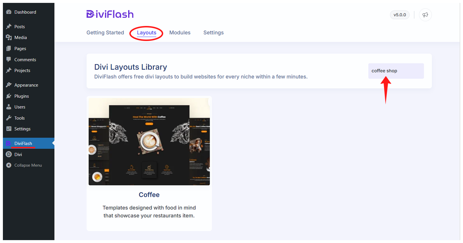 Step 3: In your WordPress dashboard, go to DiviFlash > Layouts, then search for “Coffee.”
