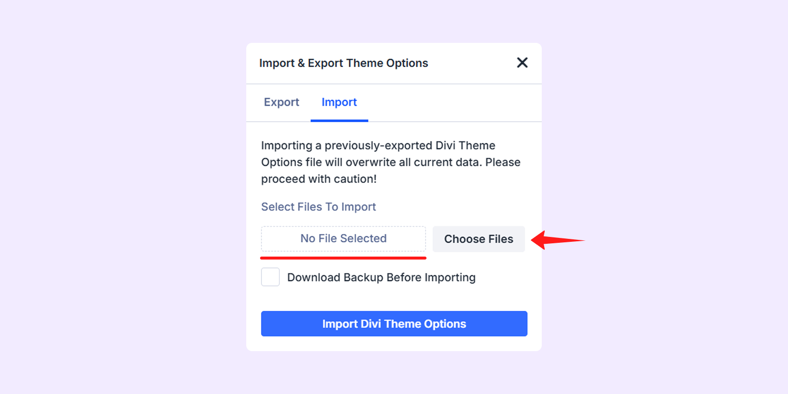 - Select the Import tab and click “Choose Files” to upload the JSON file named “Divi Theme Options – Coffee Layout – Diviflash.json”