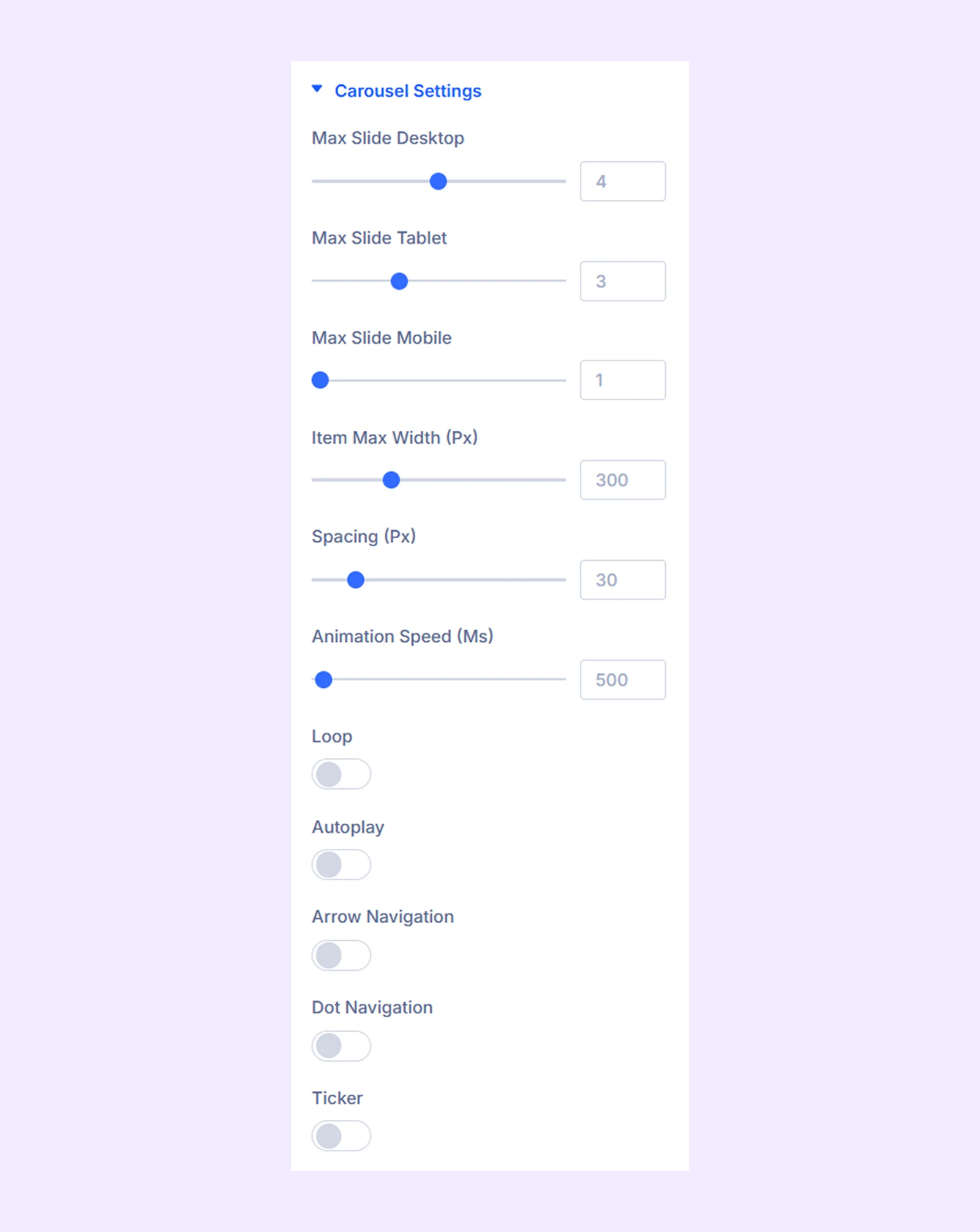 Note: When “Ticker” is enabled, all the other effects (Loop, Autoplay) and navigation options (Arrow, Dot) will be disabled.