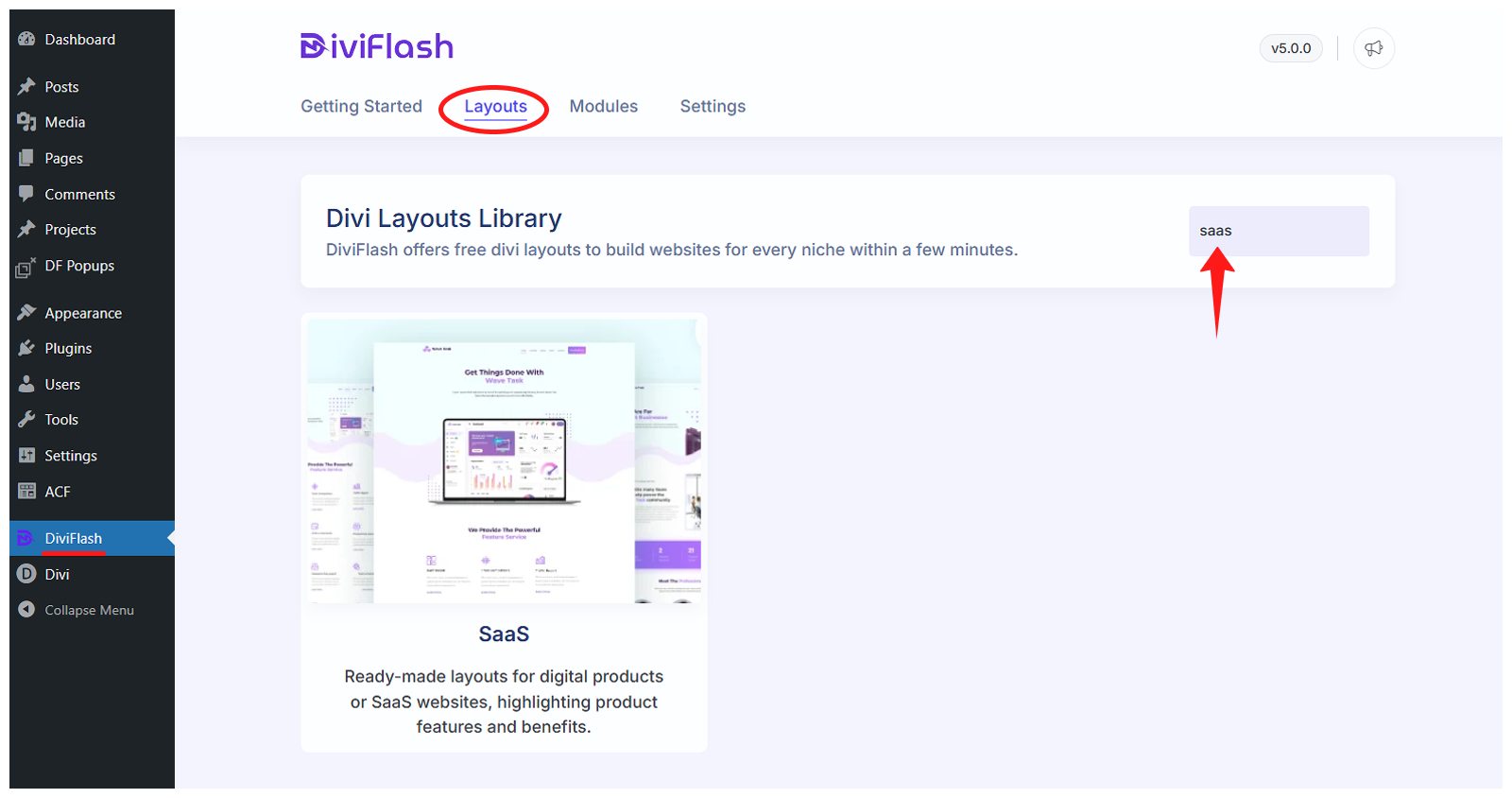 Step 3: In your WordPress dashboard, go to DiviFlash > Layouts, then search for “SaaS.”