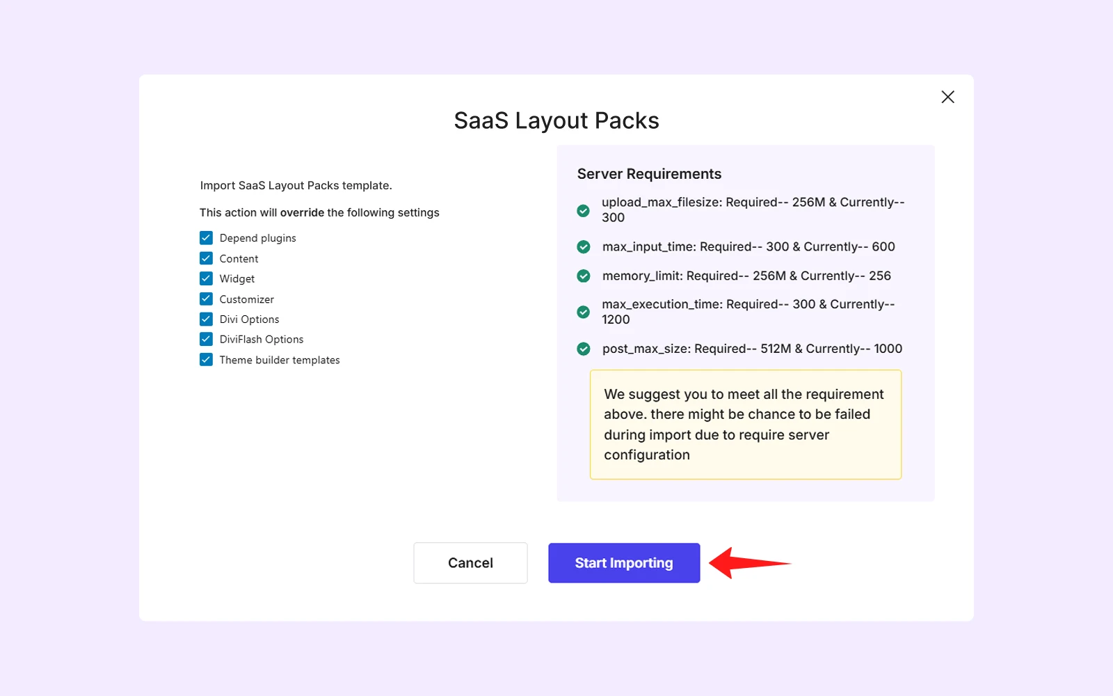 - A popup will appear showing the layout settings and server requirements. Make sure all items have green checkmarks. If you see any red crosses, update your server settings and refresh the page. Once everything is ready, click Start Importing.