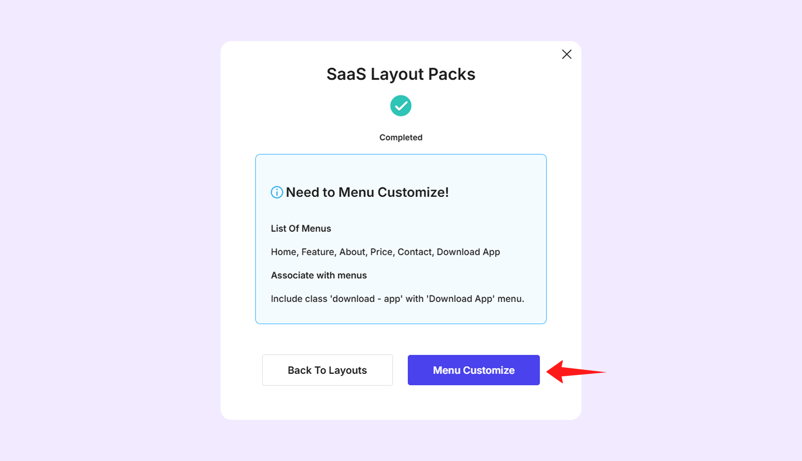 - Afterward, click “Menu Customize” to adjust the menu for the layout. While creating the menu, be sure to include CSS class to the “Download App” menu. You can follow Divi Layout Menu Customization guide.
