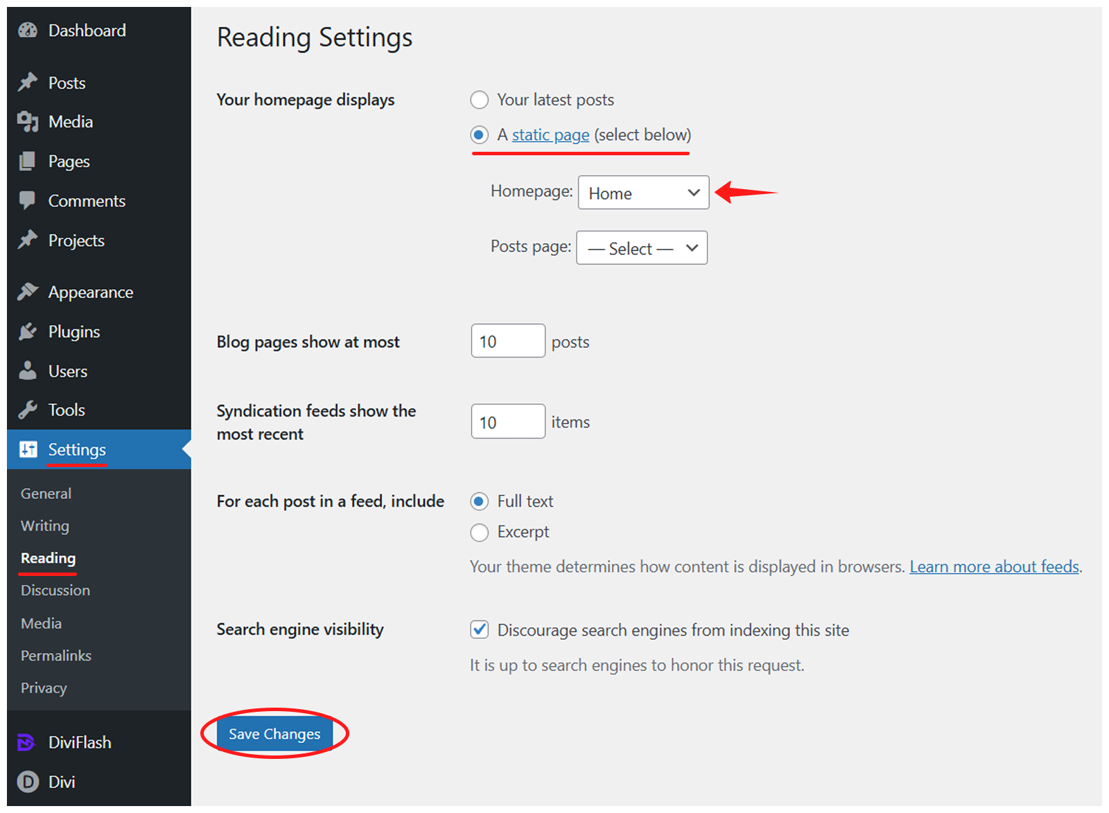 - Navigate to the WordPress Dashboard > Settings > Reading.