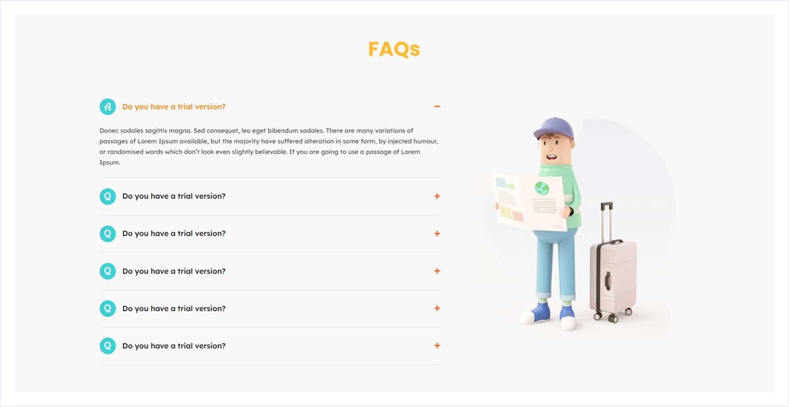 A two-column FAQ layout with expandable questions and a friendly visual illustration. Ideal for service-based or informational websites that want to keep FAQs approachable and easy to browse.